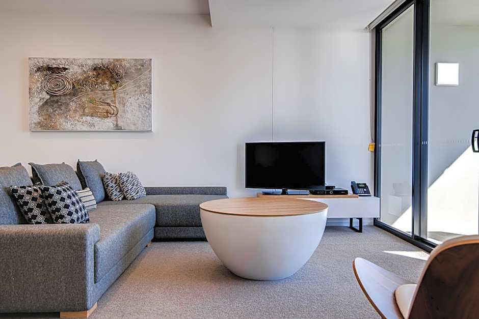 This studio features a King Bed, en suite, small sitting area, mini refrigerator, tea and coffee making facilities and a balcony with hinterland views. The studios are suited for the business traveler looking for a modern room close to restaurants, cafes and the airport.